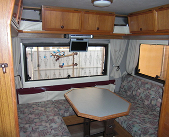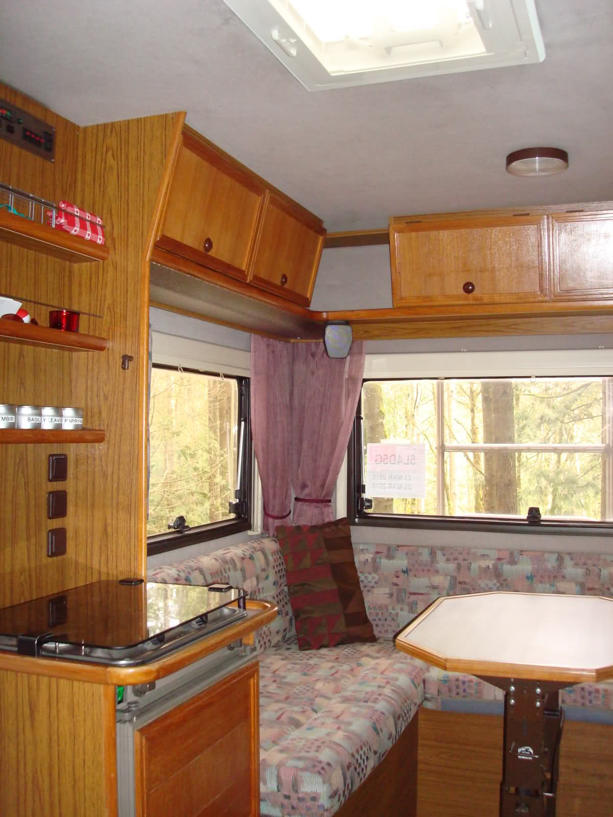 Tevens voorzien van 5 (vijf!) slaapplaatsen, 2 in de tot bed om te toveren rondzit (1.98 bij 1.30), 2 boven in de alkoof (2.05 bij 1.30) en een slaapplaats voor een kind tot maximaal 1.60 lang in een hangmat boven de voorstoelen.